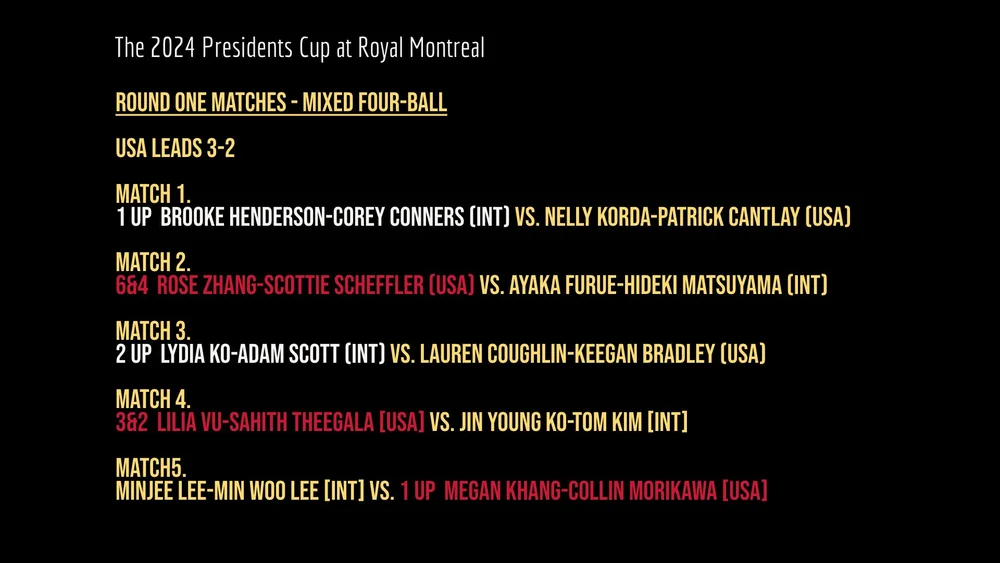 USA takes a one point lead after Thursday's competitive matches featuring mixed Four-ball action for the first time in event history.*